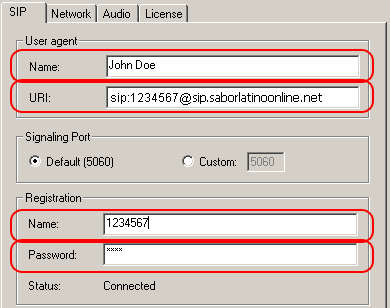 Enter: SIP<phone number> @sip.saborlatinoonline.net