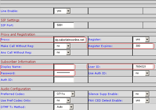 Change the “Preferred Codec” to G729a. Also change the “Use Pref Codec Only” to Yes. You can do this for both Line 1 and PSTN (i.e. if you are going to use PSTN).